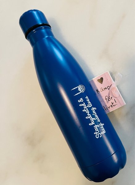 Blå vattenflaska med texten ”Stay hydrated & keep saving lives” från Islamic Relief.