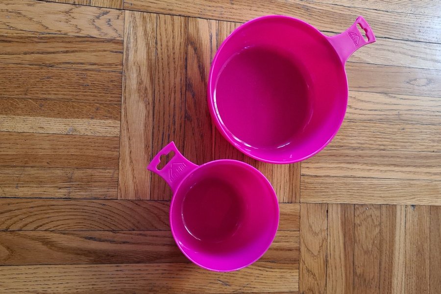 Två rosa plastkåsor med måttangivelse. Den större 1-7 dl, den mindre 1-3 dl.