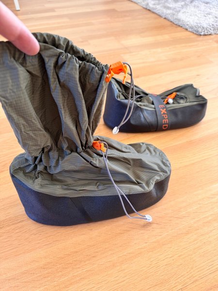 Exped Bivy Booty i olivgrön färg. Det är ett vattentätt skoöverdrag för alla Expeds Camp Bootties, Down Socks och Camp Slippers. Har två dragsko för att stänga öppningen och tighta till vid fotleden. Använd en gång men för stora för mig. Storlek M.