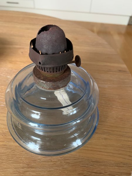 En klassisk fotogenlampa med en blåtonad glasbehållare. Veken finns inuti.
