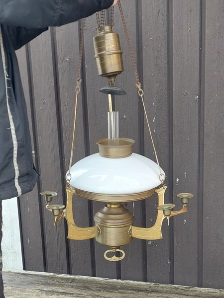 Fotogenlampa är i mässing från Jugendperioden. Den är i fint skick. 90x50 cm