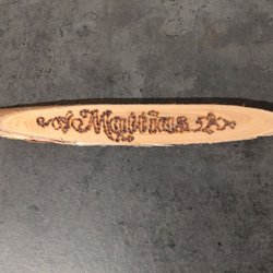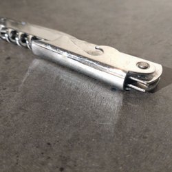 Borrsväng i metall med handtag i trä. Handtagen är ljusblå. Längd cirka 35 cm. Borrsvängen är utrustad med spärrhake som på ett spärrskaft. Du kan alltså backa utan att borren gör det.