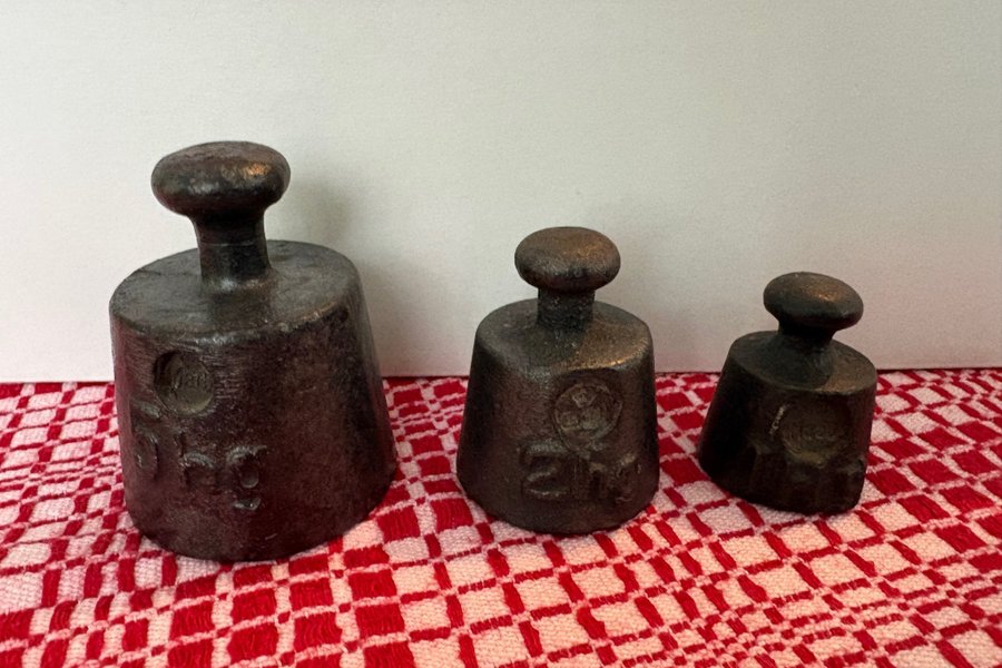Tre vikter i metall. De är märkta med 500g, 200g och 50g. Tyngsta vikten är ca 5 cm hög