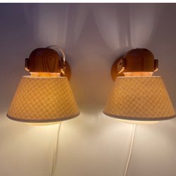 Säljer Ett par Vägglampor från Solbacken furu retro design 70-tal . Lamporna har en träfot och en skärm i textil.