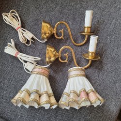 En vägglampa från Luxus. Lampan har en vit plast skärm och en detaljerad trä fot i mässingsfärg.