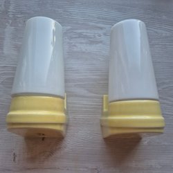 Ett par retro badrumslampetter, design Sigvard Bernadotte. Vitt porslin och vita glasskärmar.