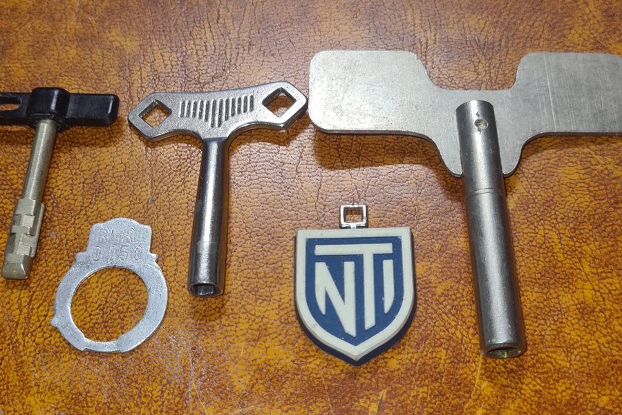 Detta parti inkluderar olika nycklar och en berlock. En av nycklarna har ett svart handtag, en annan är helt i metall med ett räfflat grepp, och ytterligare en större nyckel är också i metall. Berlocken är sköldformad med bokstäverna "NTI" i blått och vitt. Den svarta nyckeln är en bilnyckel till min gamla Ford Scorpio som numera är skrotad, två av de större nycklarna är nycklar att vrida upp klockurverk med. Klockorna finns inte kvar och är sålda alt skrotade. Har ingen som helst nytta av dessa längre så säljer dem istället.