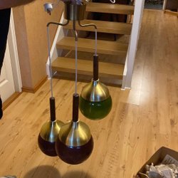 En taklampa med en frostad glas skärm och detaljer i mässing. Fungerar! Lång sladd.