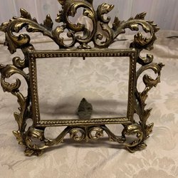 Liten vas i metall. Vasen har en elegant form med en bredare öppning som smalnar av mot basen. Den står på en rund fot och har en dekorativ, svängd detalj som förbinder vasens kropp med foten. Ytan är glänsande med en viss patina som ger den karaktär.