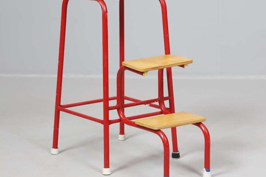 Röd stegpall i trä och metall, steg och sits i trä, två utfällbara steg.