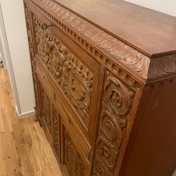 Skåpet är 2 delat men tungt då det är gediget trä, hämtas av köparen