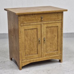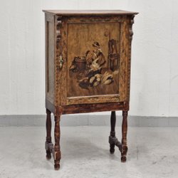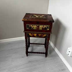 Bemærk, skal afhentes tæt ved Ishøj Station, ikke i København. Grønt skab med to låger og dekorative detaljer. Skabet har en hylde, hvor bunden dog mangler (har engang været en marmorplade). Skabet er malet i en rustik stil og har en smuk patina.