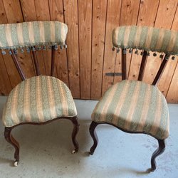Ett par vackra rokoko stolar med röd randig klädsel och detaljer i guld. Perfekt för att addera en touch av elegans till ditt hem.