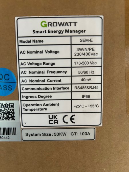 Growatt Smart Energy Manager, modell SEM-E. Den har en AC nominell spänning på 230/400Vac och ett AC spänningsintervall på 173-500 Vac. Den nominella AC-frekvensen är 50/60 Hz och den nominella AC-strömmen är 40mA. Kommunikationsgränssnittet är RS485&RJ45. Kapslingsklassen är IP66 och driftstemperaturen är -25°C till +55°C. Systemstorleken är 50KW med en CT på 100A.