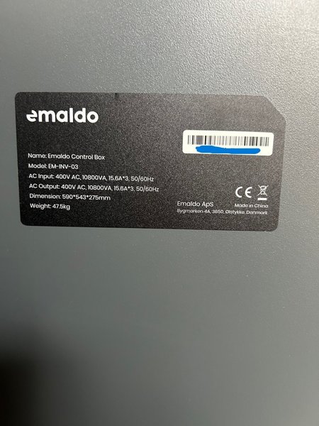 Emaldo Kontrollbox, modell EM-INV-03. Specifikationer inkluderar AC Input: 400V AC, 10800VA, 15.6A*3, 50/60Hz och AC Output: 400V AC, 10800VA, 15.6A*3, 50/60Hz. Dimensionerna är 590*543*275mm och vikten är 47.5kg. Tillverkad i Kina av Emaldo ApS, Bygmarken 4A, 3650, Ølstykke, Danmark.