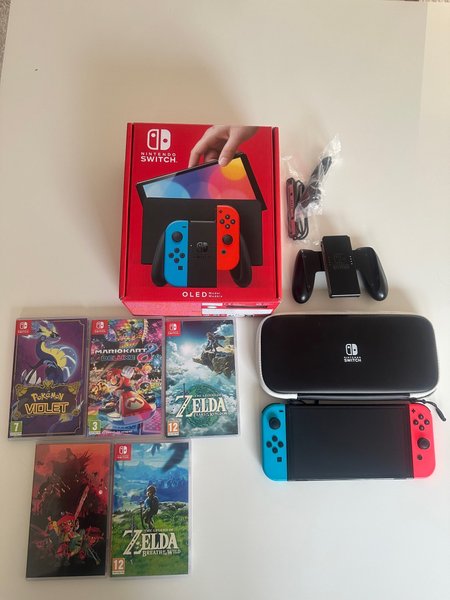 Nintendo Switch OLED-konsol i absolut nyskick!! Knappt använt, inga repor eller märken alls! Ingår tillbehör och spelen: Pokémon Violet, Mario Kart 8 Deluxe, The Legend of Zelda: Tears of the Kingdom, Splatoon 2 och The Legend of Zelda: Breath of the Wild.