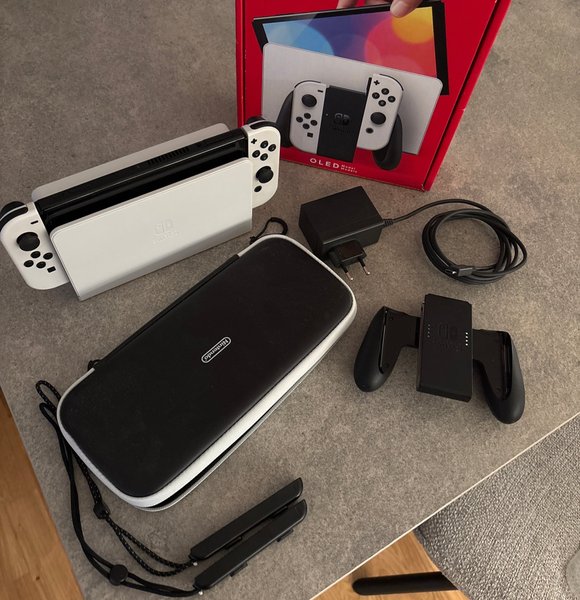 Nintendo Switch OLED med tillbehör. Konsolen är i fin skick utan skador eller repor.