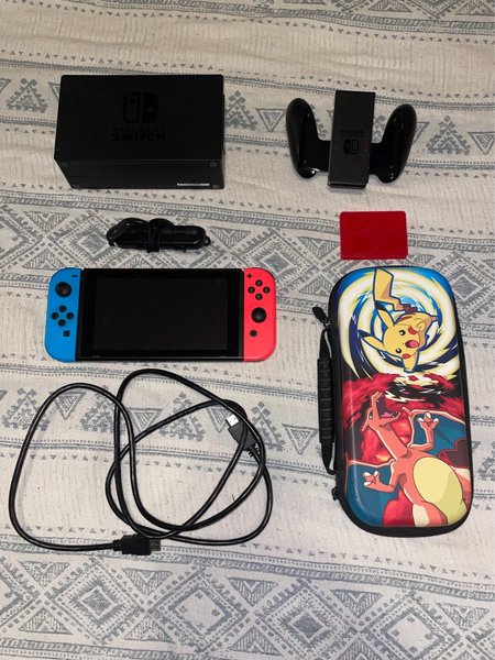 Nintendo Switch med tillbehör. Inkluderar dockningsstation, joy-con grepp och fodral.