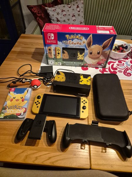Nintendo Switch Pikachu & Eevee Edition. Allt på bilden ingår: spelet Pokémon: Let's Go, Pikachu!, dockningsstation med Pikachu och Eevee-tema, joy-cons, handkontrollfäste, ett fodral m.m.