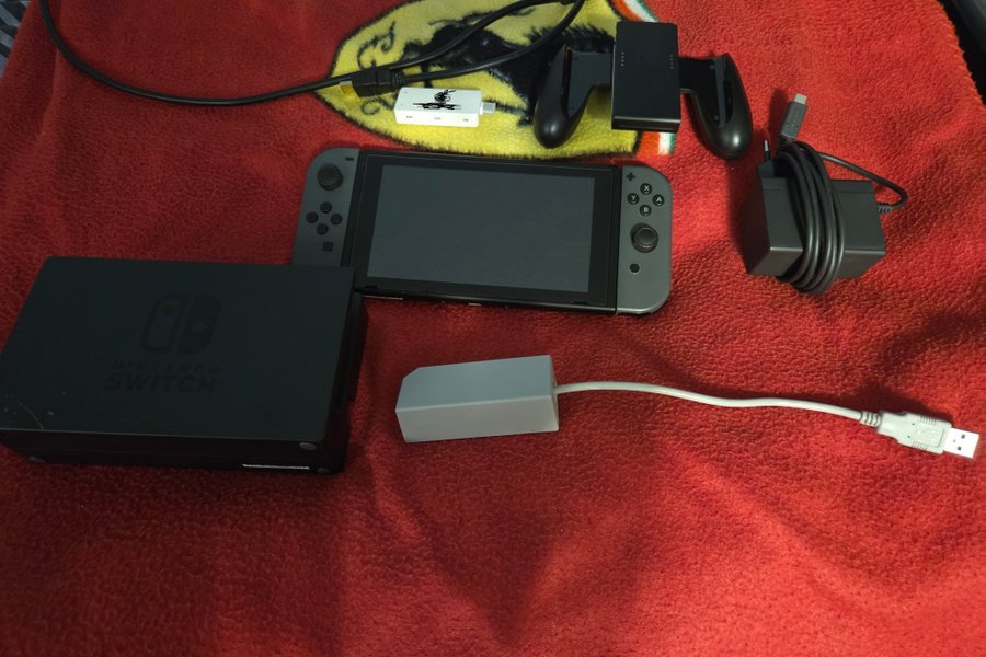 Nintendo Switch med tillbehör. Den första versionen som är bra om man vill testa egna grejer. Knapparna är jättebra då har nästan enbart spelat dockat i dockat läge och skärmskydd har alltid suttit på. Ingår utöver det vanliga även en ethernet -adapter med mera. Den enda defekten är ett par skråmor på dockan i det vänstra nedersta hörnet.