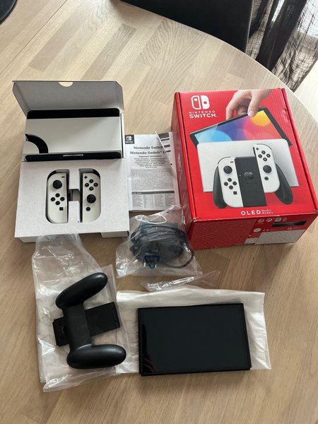 Nintendo Switch OLED Model med Joy-Cons. Konsolen levereras med dockningsstation, Joy-Con-grepp och strömkabel.