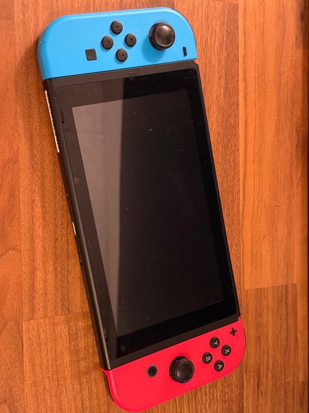 Nintendo Switch konsol med aftagelige Joy-Con-controllere i blå og rød. Konsollen har en skærm og kan bruges både som håndholdt enhed og tilsluttet et tv.