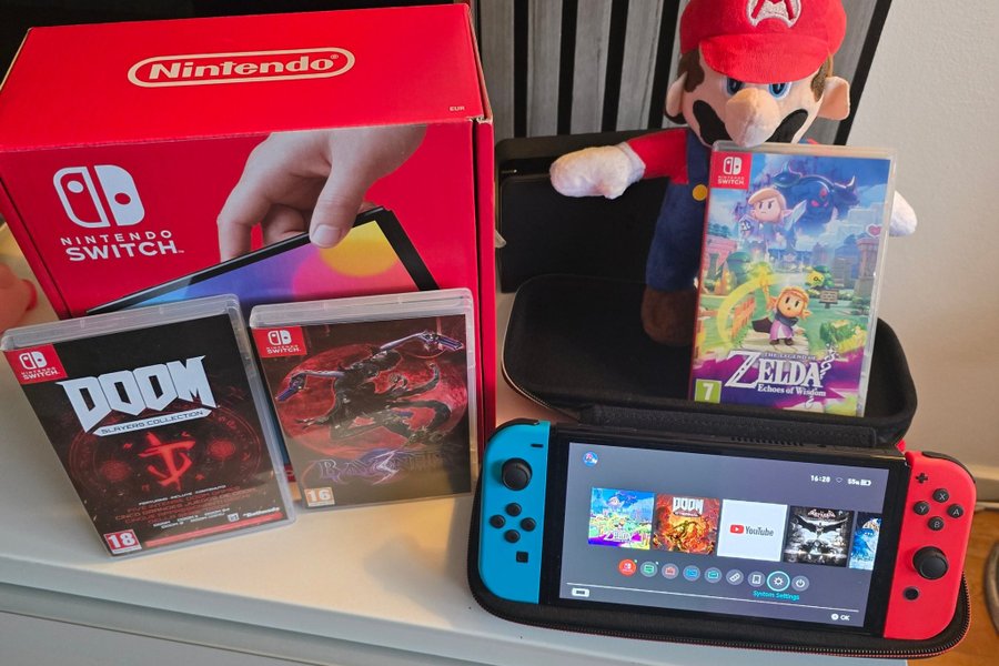 Nintendo Switch OLED konsol i nyskick med Joy-Cons och alla originaltillbehör. Följande spel ingår: The Legend of Zelda: Echoes of Wisdom, Bayonetta 3 och Doom Slayers Collection. En Mario-mjukisleksak ingår också om man vill och bärväska. Switchen är i nyskick och endast spelad på några få timmar. Pedantskött och aldrig laddad till mer än 80 % för att bevara batterihälsan.