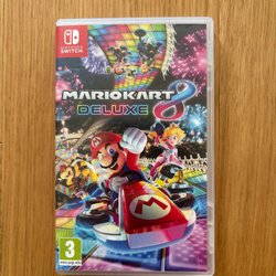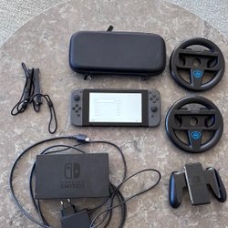 Nintendo Switch konsol med ett par Joy-Con-kontroller (en blå och en röd). Konsolen levereras med en dockningsstation för anslutning till TV. Ett Joy-Con-grepp för att kombinera Joy-Cons till en mer traditionell handkontroll ingår också. Förvaringsfodral för konsolen medföljer.
