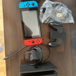 (Jag inkluderar även ett andra par Joy-Cons (de röd/blå) där åtminstone den ena är defekt. Kanske är det något som går att laga eller komma runt, men se dem inte som en del av annonsen.)