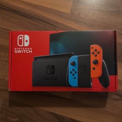 Nintendo Switch OLED Model med Joy-Con-controllere i neonblå og neonrød. Inkluderer en dockingstation, Joy-Con-håndledsremme, strømadapter og HDMI-kabel.