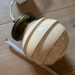 En charmig taklampa med en vit glaskupa och detaljer i smide. Lampan hänger i en dekorativ kedja. Perfekt för att skapa en mysig atmosfär i hemmet.