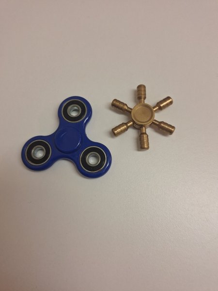Säljer två fidget spinners. En blå trearmad och en guldfärgad sexarmad.