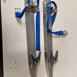 Långfärdsskridskor med blå remmar för bindning. Skridskorna är designade för att användas på naturisar och har en stabil konstruktion för åkning.