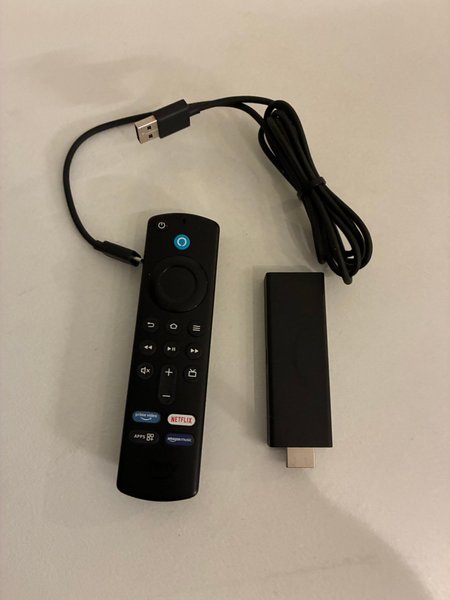 Amazon Fire TV Stick med fjärrkontroll och strömkabel.