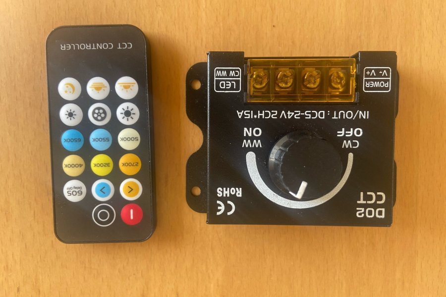 Säljer en CCT Controller D02. Denna enhet har en fjärrkontroll och är avsedd för att justera färgtemperaturen på LED-belysning. Ingångs- och utgångsspänningen är DC5-24V 2CH*15A. Enheten är märkt med CE och RoHS.