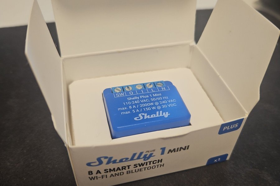 Shelly Plus 1 Mini, 8 A smart switch med Wi-Fi och Bluetooth. 110-240 VAC, 50/60 Hz, max 8 A / 2000W @ 240 VAC, max 5 A / 150 W @ 30 VDC.