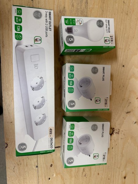Deltaco smart hem paket innehåller en smart kontakt grenuttag med 3-vägs uttag och 2 USB-portar, en smart ljuskälla E27 och två smarta pluggar. Kompatibla med Amazon Alexa och Google Home. Aldrig använt!