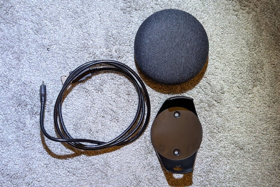 Säljer en Google Nest Mini grå med laddkabel och väggfäste.