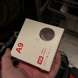 IP-kamera för övervakning. Kameran är förpackad i en vit och röd kartong.