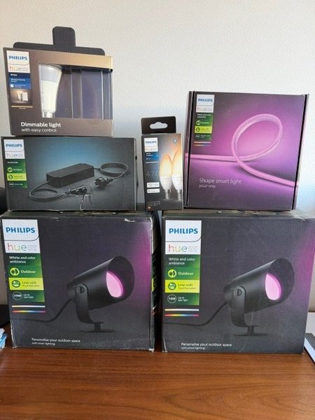 NYA i förpackning: 2 st Hue Lily (utomhus spottar), 1st 2 meterLED-list, nätdel, 2 st E14 candle, 1 st E27 vit.