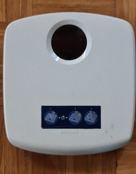 Digital badrumsvåg från Philips. Äldre modell. Möjligt att ändra till stones/pounds, kilogram samt pounds. Batteri medföljer ej. Vågen har varit vit men gulnat. Finns även lite skavmärken.