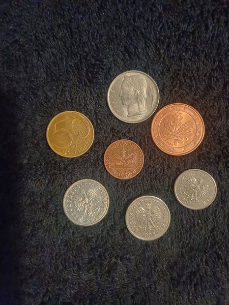 En samling av olika valutor. Inkluderar en tysk mynt från 1950, en österrikisk mynt från 1984, en tysk euro cent från 2004, en tysk mark från 1975 och polska zloty från 2002 och 2009.