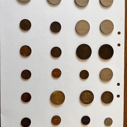 Två äldre mynt. Det större myntet har årtalet präglat. Det mindre myntet har texten 1 ÖRE S.M. präglat.