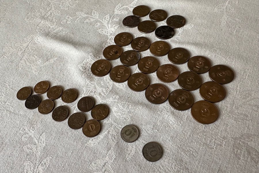Parti med blandade ören. 24 2-öringar (30-talet till 1969). 11 ettöringar (50-60-talet). 2 tioöringar.