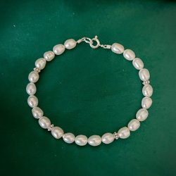 Ett armband med kallt ljusblå sötvattenpärlor med detaljer och låsdelar i 925 Sterlingsilver. Pärlstorlek 6,5 x 4 mm. Längd 18,7 cm.