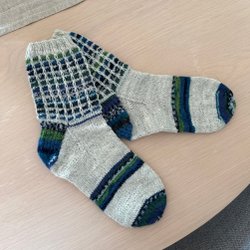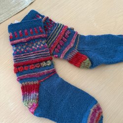 Säljer ett par vackra handstickade sockor i blått och grönt med fina mönsterdetaljer.
