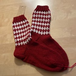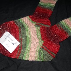 Ett par handstickade strumpor I acryl i glada färger. Strumporna har ränder i rött, grönt och rosa med glittertrådar. Fina till jul. Storlek 38/39.