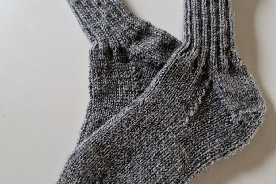 Ett par handstickade gråmelerade sockor. 60% Ull, 20% Nylon, 20% Akryl. Storlek 38.