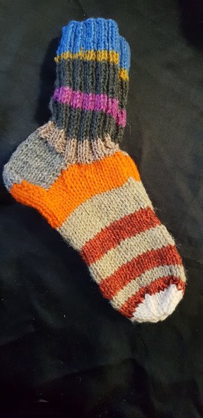 Färgglad stickad strumpa med ränder i olika färger som blått, gult, grått, lila, orange, beige, rött och vitt.