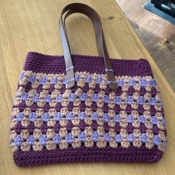 Virkad sjal i triangelform med tofs. Färgerna är rosa, beige och lila.